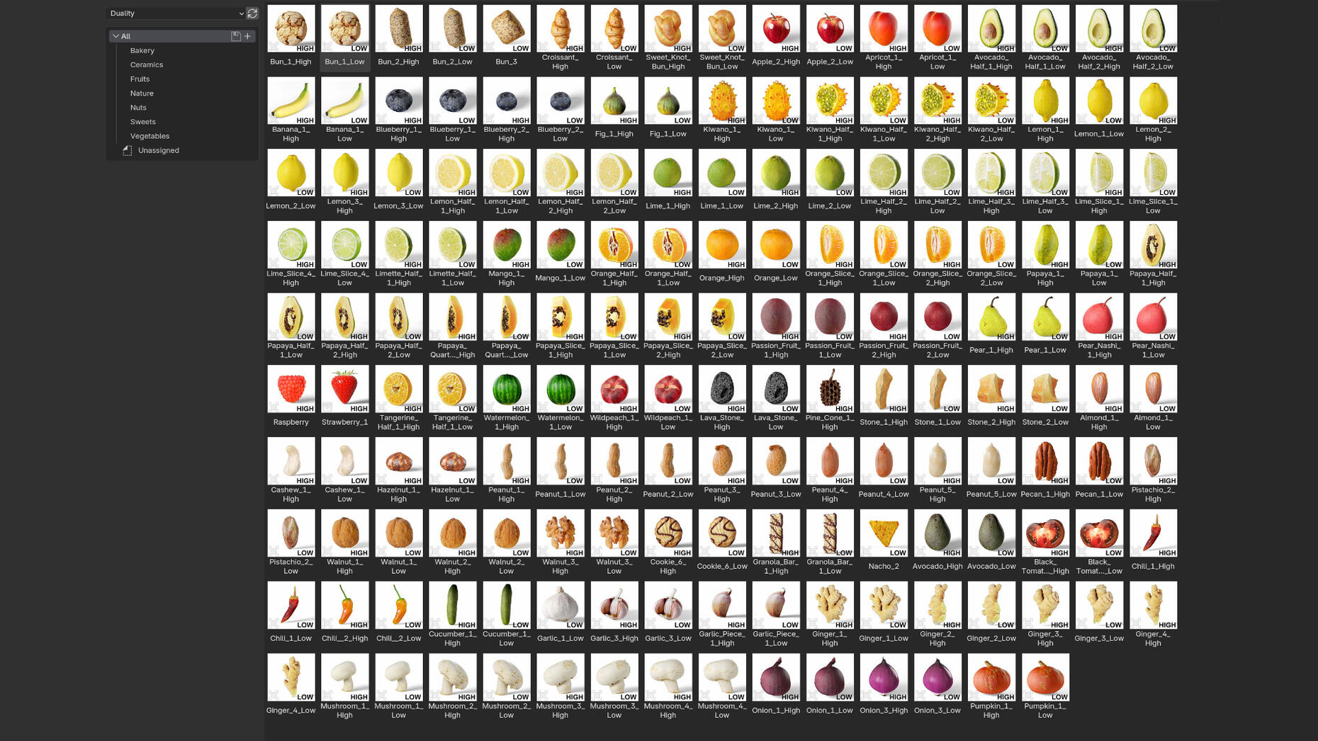 Duality is a curated suite of 91 (and growing) photo-scanned real world assets, aimed for realism. All assets have been retopologized to quads.